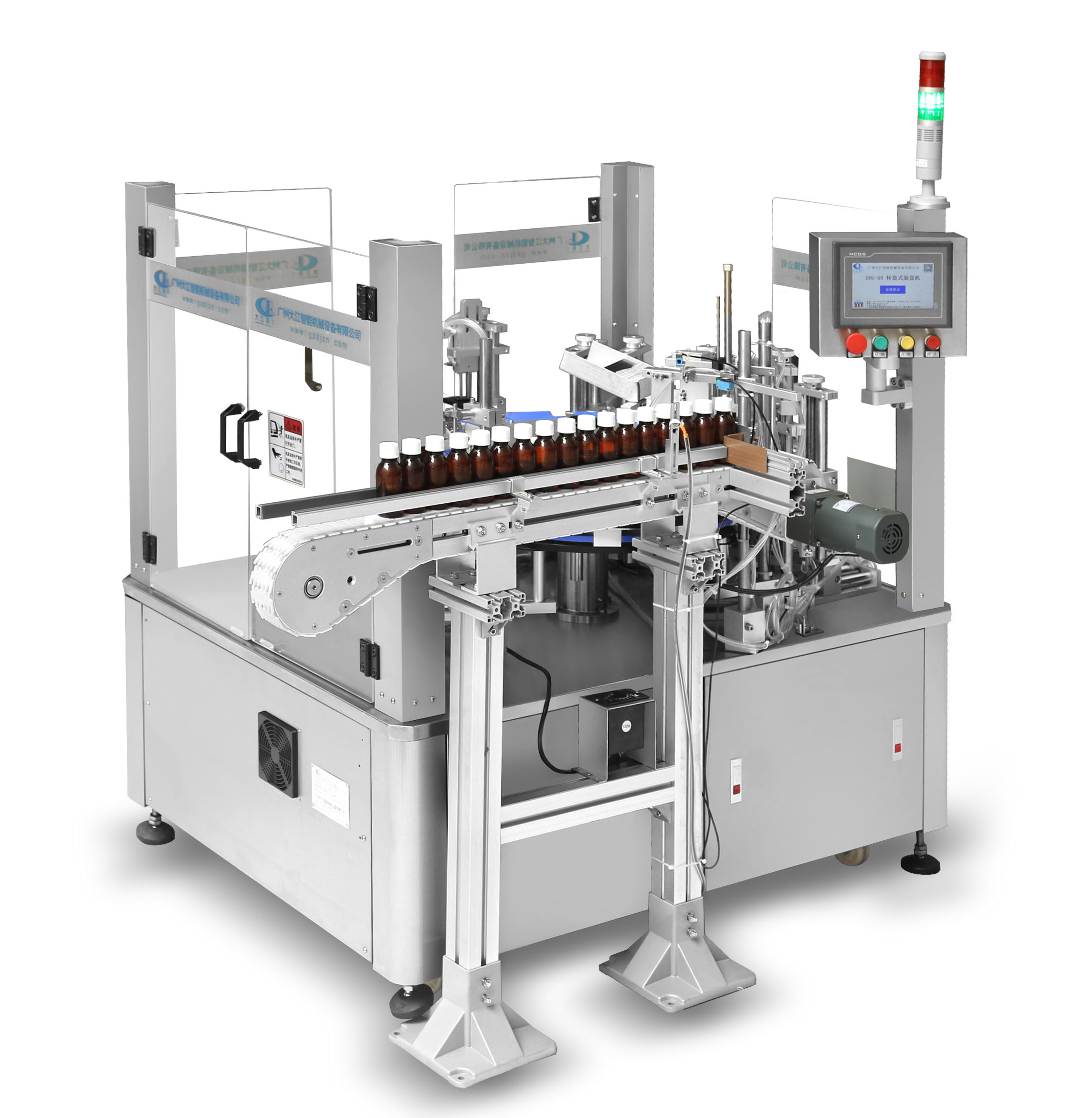 DDU-1603 立式圓瓶定位貼標機 適用范圍:用途廣泛!主要適用于醫藥、日化、食品等行業的圓柱形包裝容器或小錐度的圓錐形包裝容器的單標、雙標自動定位貼標.該機拓展性強!可選配各類打印機完成在線實時打印,可單機使用,亦能連接生產線使用 主要性能結構特點:1、中英文觸…
